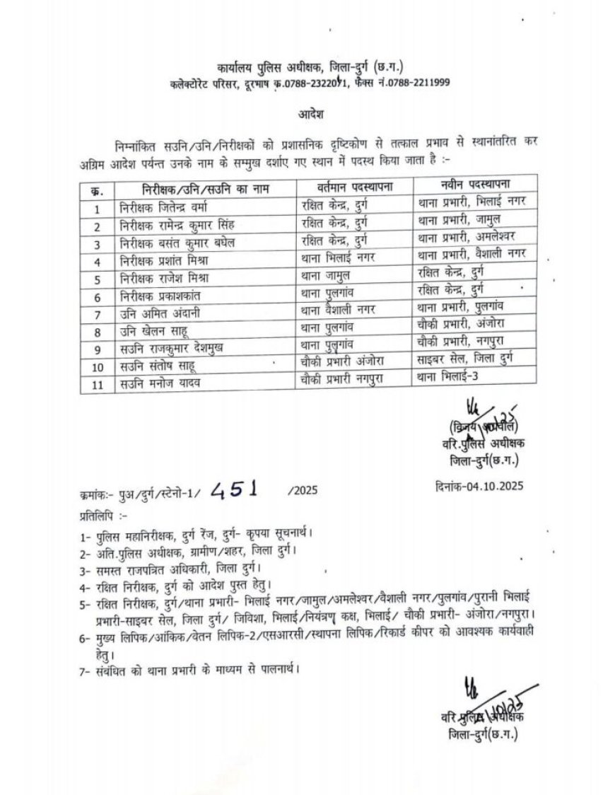 वहीं निरीक्षक प्रशांत मिश्रा का स्थानांतरण थाना भिलाई नगर से वैशाली नगर, निरीक्षक राजेश मिश्रा का थाना जामुल से रक्षित केंद्र दुर्ग, और निरीक्षक प्रकाशकांत का थाना पुलगांव से रक्षित केंद्र दुर्ग किया गया है।