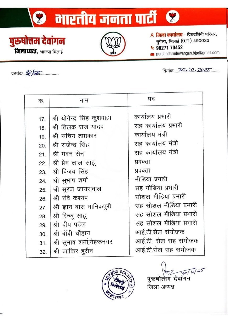भारतीय जनता पार्टी छत्तीसगढ़ ने प्रदेश अध्यक्ष श्री किरण सिंह देव और संगठन महामंत्री श्री पवन साय की सहमति से भिलाई जिला भाजपा की नई कार्यकारिणी घोषित कर दी है। नई टीम में संगठन की मजबूती और बूथ स्तर तक पार्टी विस्तार को ध्यान में रखते हुए वरिष्ठ व युवा नेताओं को शामिल किया गया है।