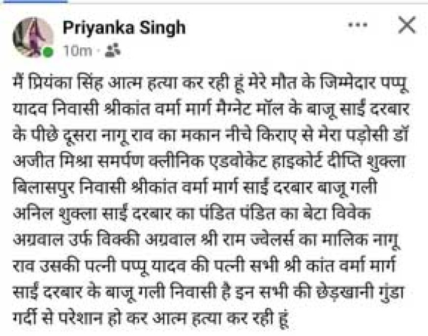 मैं प्रियंका सिंह आत्महत्या कर रही हूं। मेरी मौत की जिम्मेदार पप्पू यादव है निवासी श्रीकांत वर्मा मार्ग... नागू राव.. मेरे पड़ोसी डॉक्टर अजीत मिश्रा समर्पण क्लिनिक... हाईकोर्ट एडवोकेट दीप्ति शुक्ला बिलासपुर निवासी सांई दरबार... अनिल शुक्ला साई दरबार का पंडित, पंडित का बेटा है।